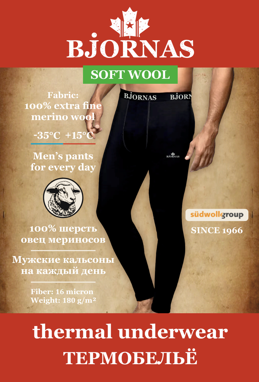 ТЕРМОКАЛЬСОНЫ МУЖСКИЕ BJORNAS "SOFT WOOL" CANADA MERINO 100% МЕРИНОС (+15⁰С -35⁰С) НА КАЖДЫЙ ДЕНЬ (BLACK)