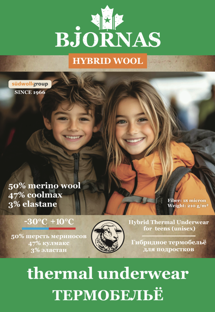 Двухслойный гибридный термокомплект для мальчиков-подростков (кальсоны и лонгслив с длинным рукавом) от канадского бренда BJORNAS (Бйорнас) из натуральной шерсти мериносов немецкого холдинга Suedwolle Group комбинированного с технологичным материалом Coolmax. Данное термобелье отлично подойдет для активных прогулок, туризма и отдыха в холодное время года, а также, занятий зимними видами спорта.