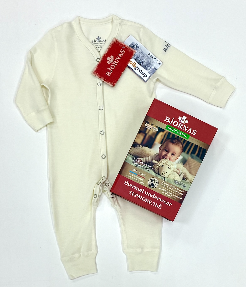 Термокомбинезон для новорожденных малышей повседневной линейки "Soft Wool" от канадского бренда BJORNAS (Бйорнас) из натуральной самой мягкой и нежной 100% самой шерсти овечек мериносов экстра-класса немецкого холдинга Suedwolle Group. Использовать в качестве нательного слоя для повседневной носки, как во время прогулок, так и для сна и отдыха, комфортный запас для подгузников, удобный анатомический крой. Комбинезон выполнен с застежками на кнопочках для удобства в одевании. Полотно выполнено из очень мягкой шелковистой шерсти мериноса, которая мгновенно впитывает и испаряет излишнюю влагу с поверхности кожи малыша, сохраняя оптимальный микроклимат между кожей и термобельем.