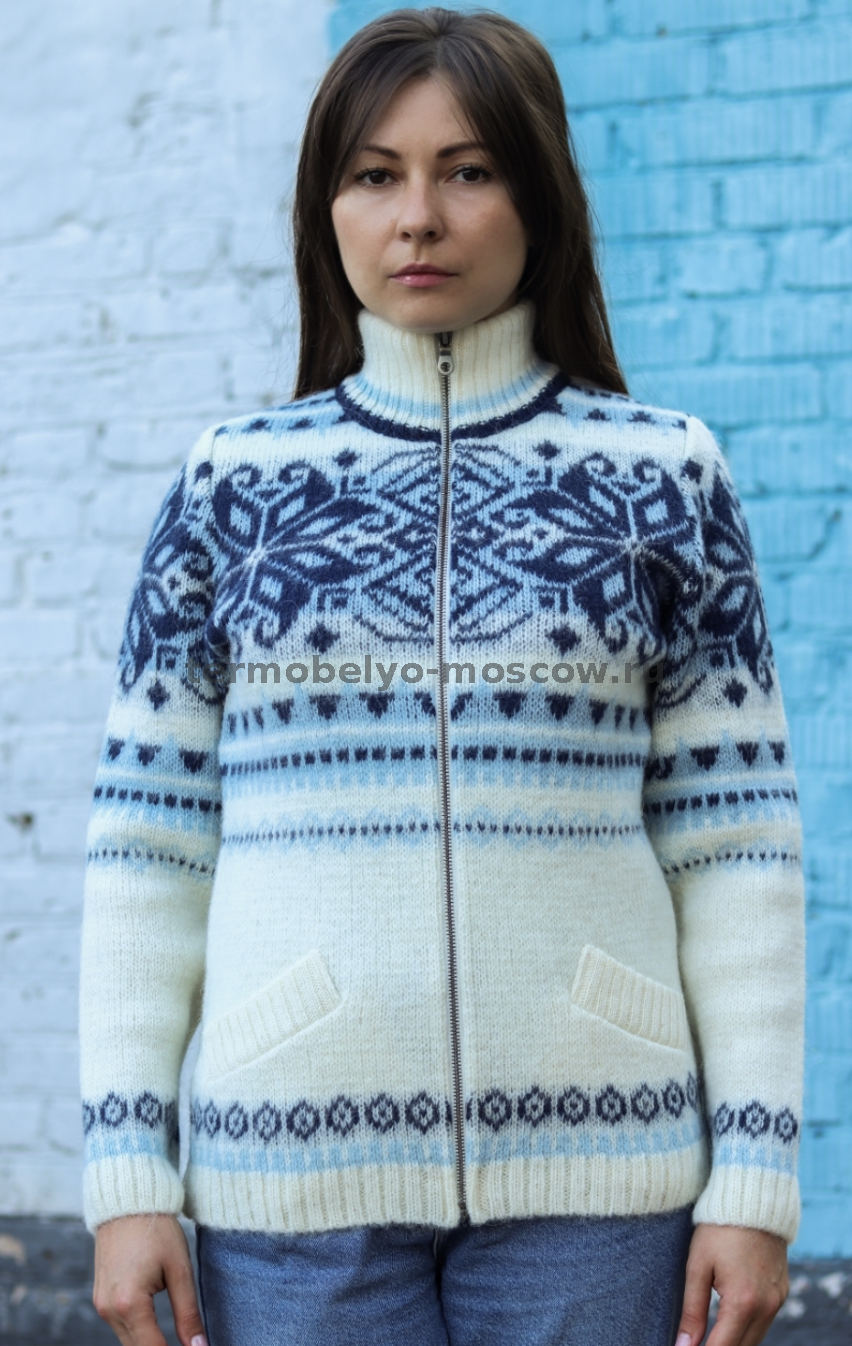 Нарядный зимний женский кардиган на молнии от бренда Freyja из Исландии из 100% экологичной шерсти нордических породистых овец, премиум пряжа (Icelandic Wool LOPI). Очень стильный светлый свитер для нарядного настроения и защиты от холода. Двухслойное плотное плетение самого теплого вида шерсти гарантирует максимальную защиту в морозную погоду, потому-что именно исландские овечки максимально адаптированы к суровым условиям северного скандинавского климата. Исландская шерсть исключает переохлаждение, эффективно испаряет излишнюю влагу, пропускает воздух и регулирует теплообмен. Очень женственный образ в стиле старых скандинавских традиций.