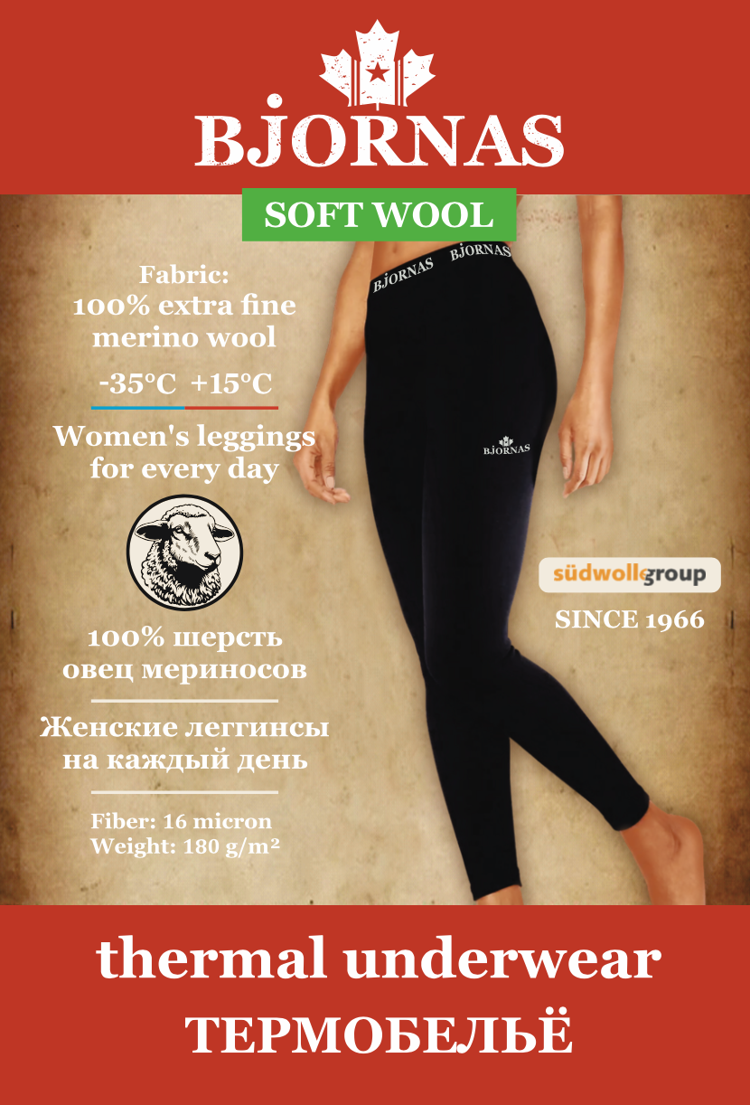 ТЕРМОЛЕГГИНСЫ ЖЕНСКИЕ BJORNAS "SOFT WOOL" CANADA MERINO 100% МЕРИНОС (+15⁰С -35⁰С) НА КАЖДЫЙ ДЕНЬ (BLACK)