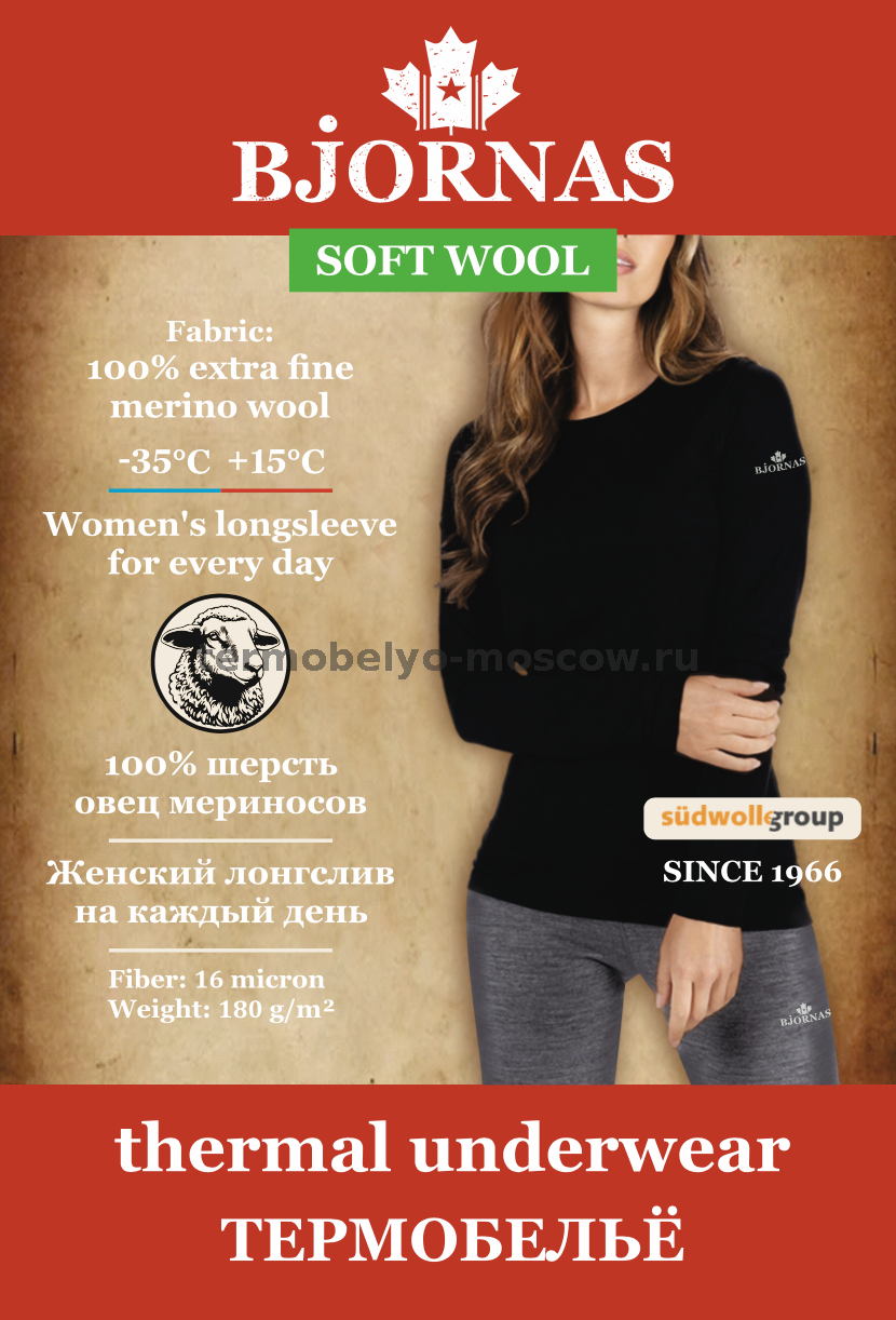 ТЕРМОЛОНГСЛИВ ЖЕНСКИЙ BJORNAS "SOFT WOOL" CANADA MERINO 100% МЕРИНОС (+15⁰С -35⁰С) НА КАЖДЫЙ ДЕНЬ (BLACK)